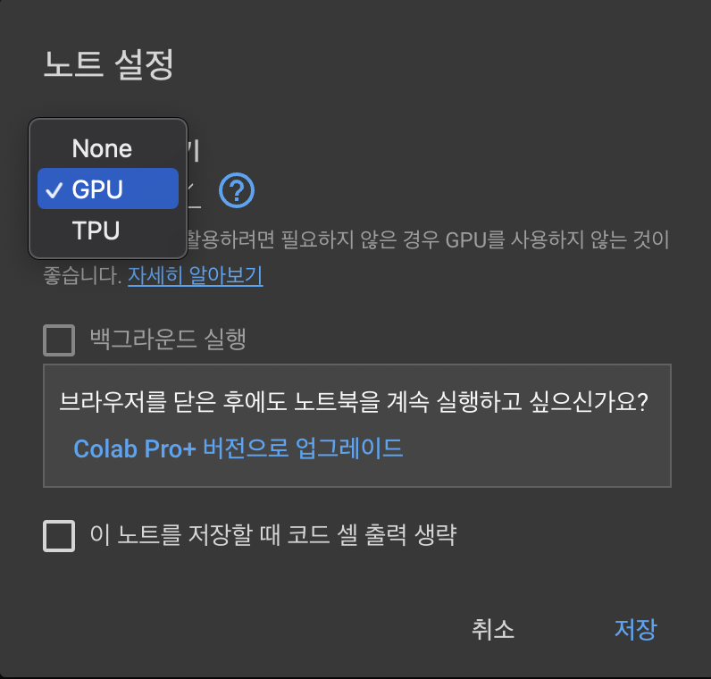 구글 코랩을 접속해서 새 파일을 만든다. 그리고 런타임 유형을 변경한다.