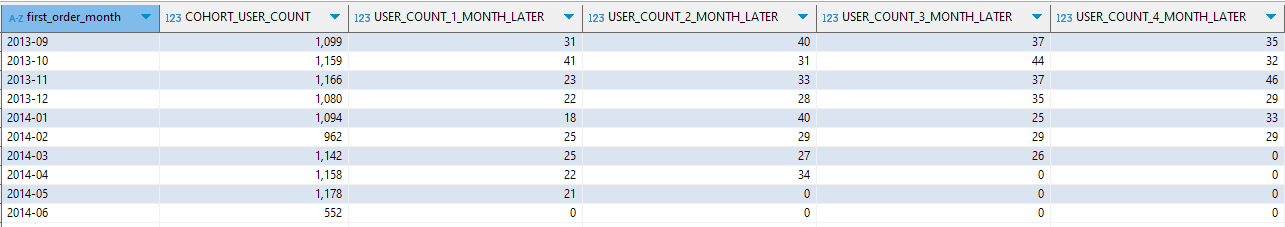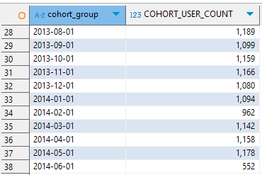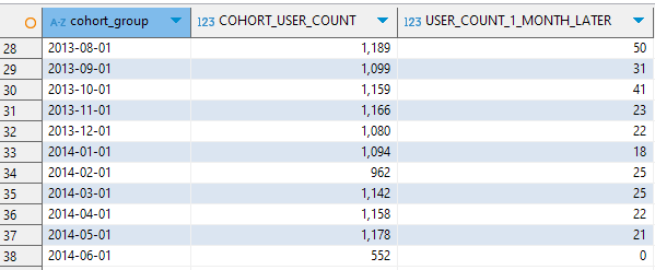 앞의 값은 실제 주문 데이터를 포맷팅하는 것이니 그대로 두고, 오른쪽 c.cohort_group을 1개월씩 뒤로 미루어가면 된다.