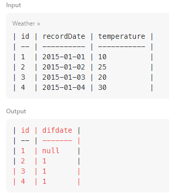 , lag(temperature, 1, null) over (order by recorddate) as 'lag_temp'