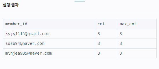 # aa의 max_cnt와 동일한 cnt 값을 가진 member_id만 남김