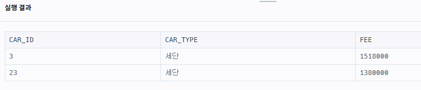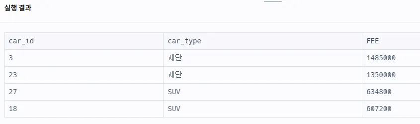 아래 실행 결과 중 SUV가 포함된 결과를 보고 있다면, car_id를 제대로 걸러내지 못했을 가능성이 높다.