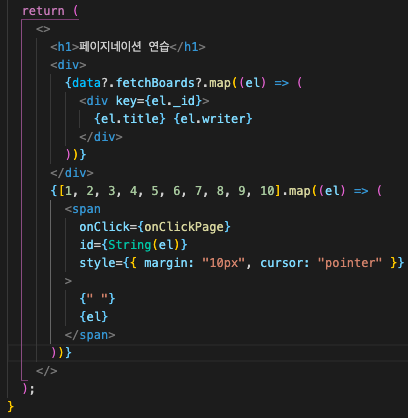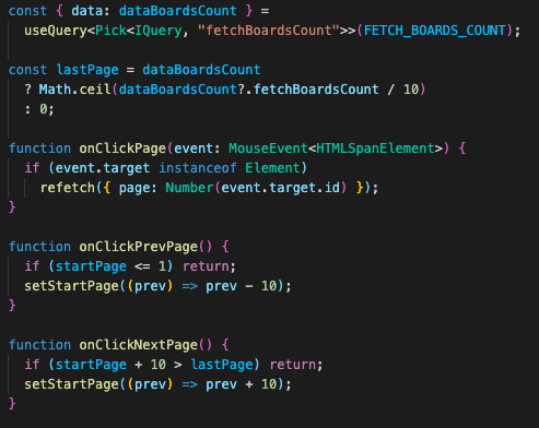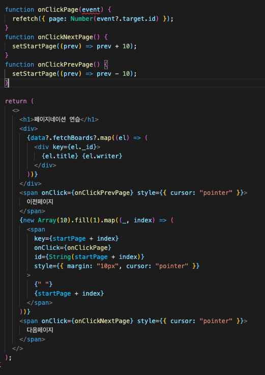 이전페이지와 다음페이지로 넘어가는 기능을 setState prev를 이용해서 만들어 줬고 배열이 너무 길어서 new Array를 이용해서 배열을 만들어줬다.