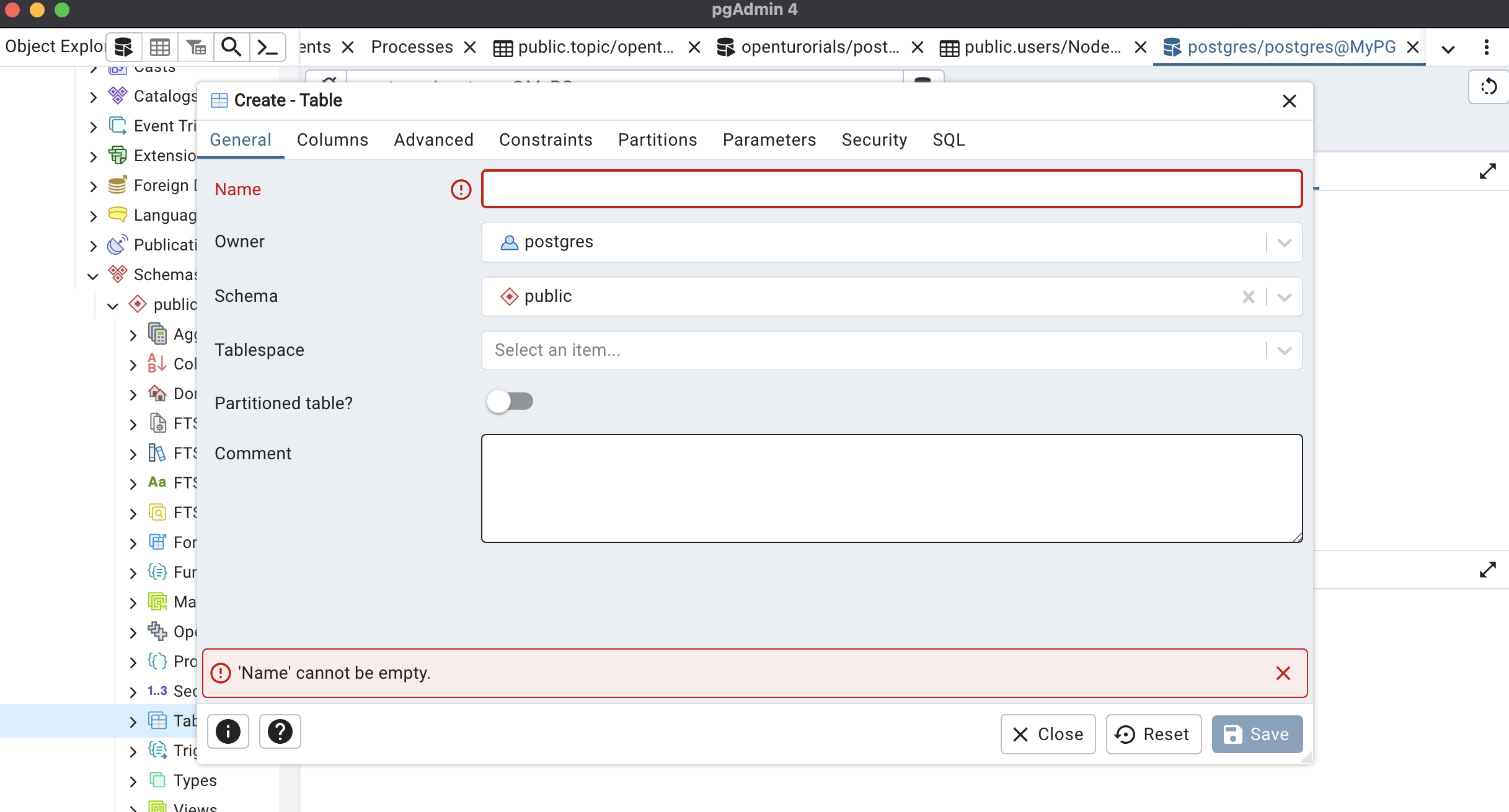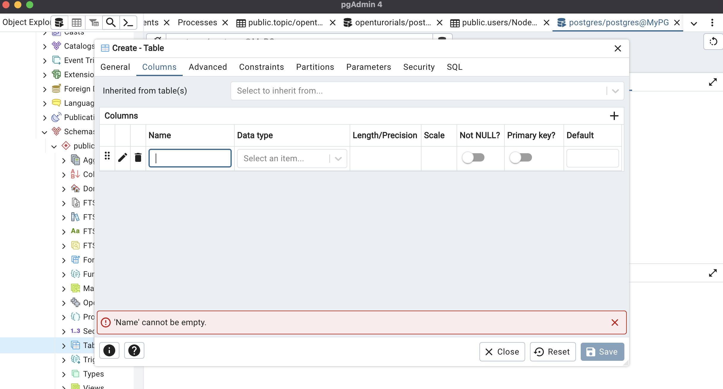 Table을 눌러 새로운 Table을 생성하고 colum을 추가