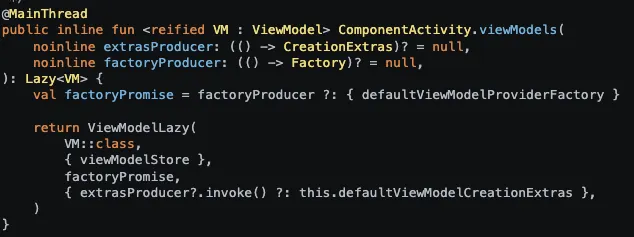 factoryProducer가 있으면 해당 팩토리를, 없으면 defaultViewModelProviderFactory 사용extrasProducer가 있으면 호출하여 CreationExtras 생성ViewModelLazy 인스턴스를 반환 (Lazy<VM> 형태로 by 사용 가능)ViewModelProvider(viewModelStore, factory, extras).get(VM::class.java)