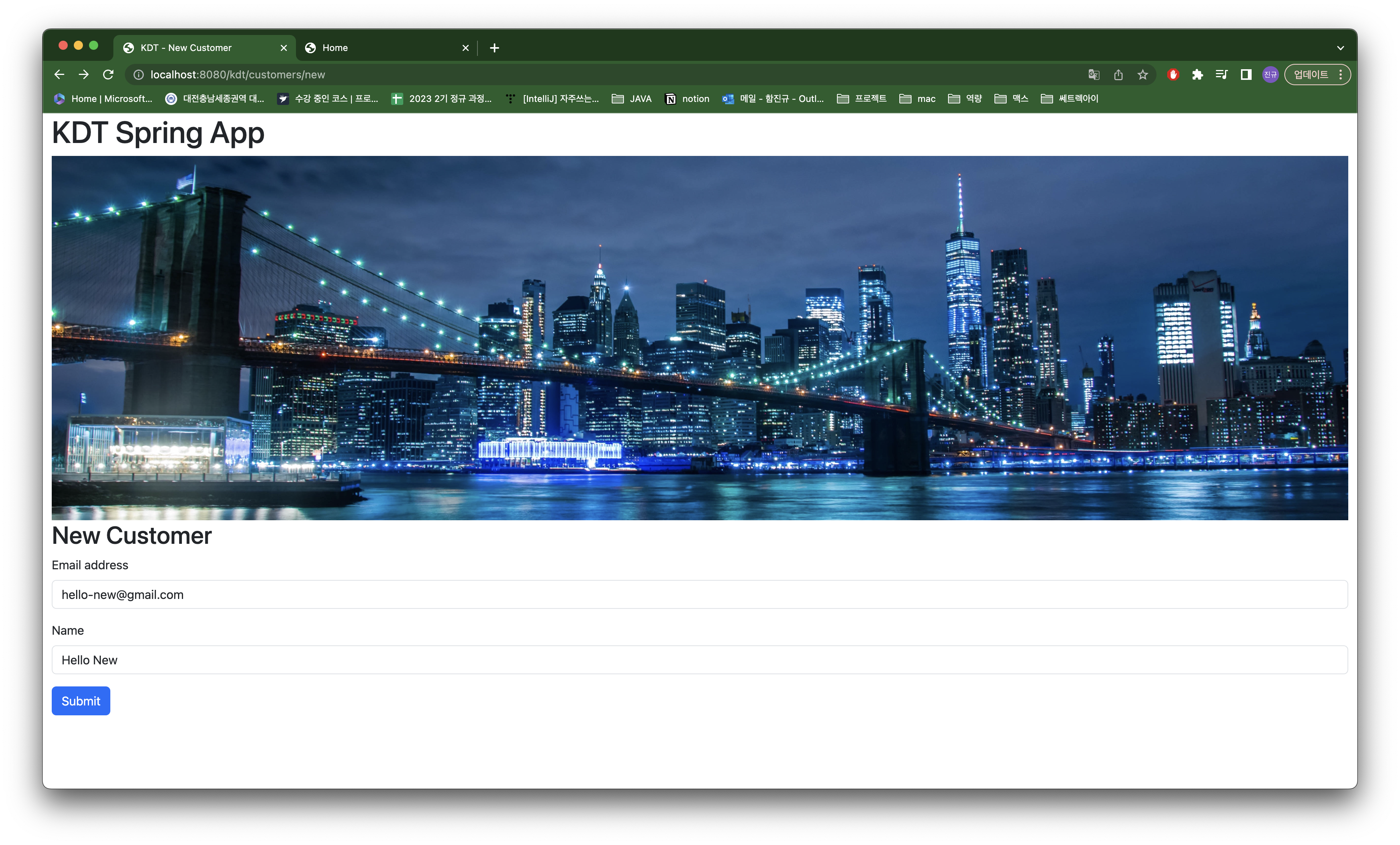 이메일과 이름을 입력받아 submit버튼을 누르면 customers/new url에 post방식으로 요청이 보내집니다.