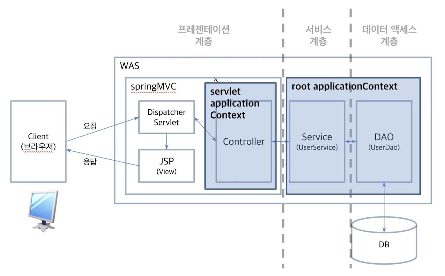 서비스계층과 데이터 액세스 계층은 여러 서블릿이 공통으로 사용하는 영역으로 이를 루트 어플리케이션 컨텍스트로 부를 수 있습니다.
