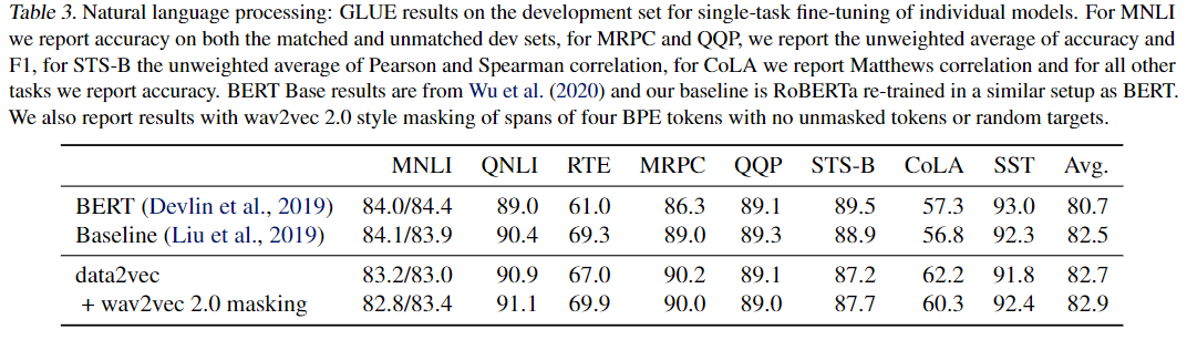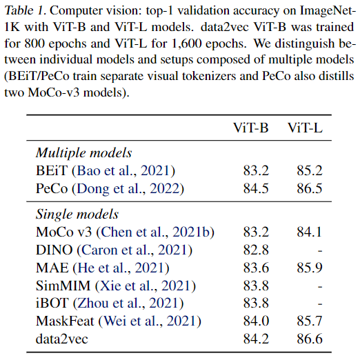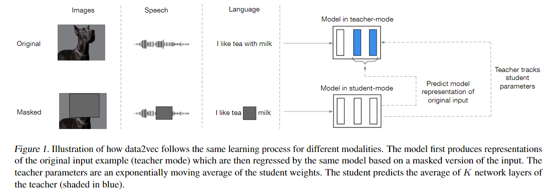 Self-supervised learning 의 일반적인 아이디어는 다양한 모달리티에 동일하게 적용될 수 있지만, 실제로 알고리즘과 objective 는 모달리티마다 달랐다. 그래서 본 논문에서는 Speech, NLP, CV 에서 같은 학습 방법을 쓸 수 있는 하나의 프레임워크, data2vec 을 제안한다.