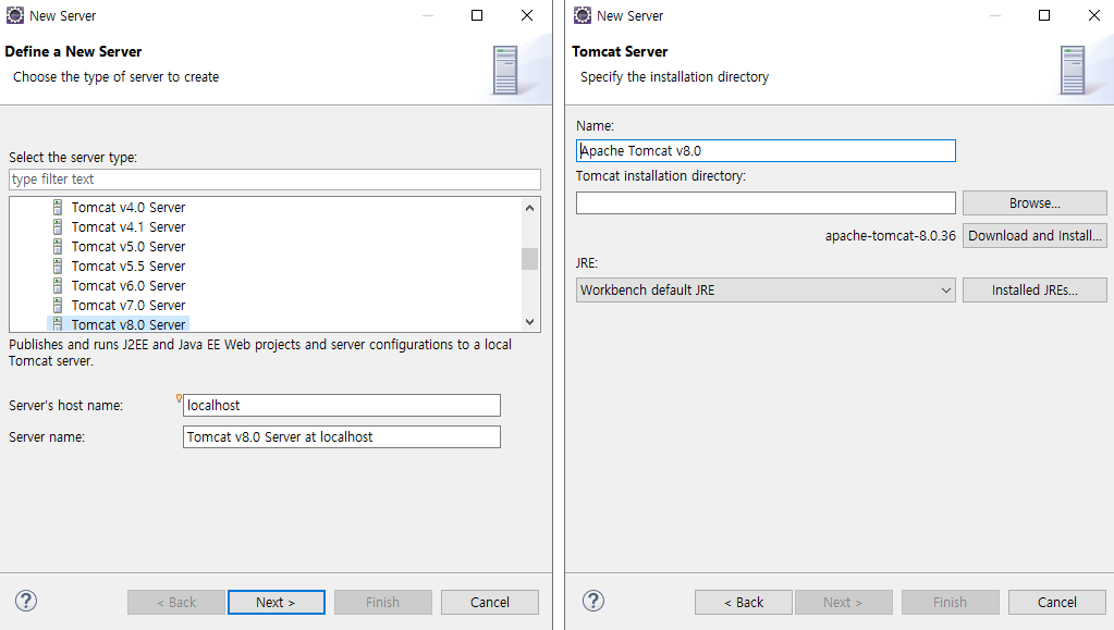 하단의 server탭에서 Tomcat8.0을 설치하여 서버를 연결.