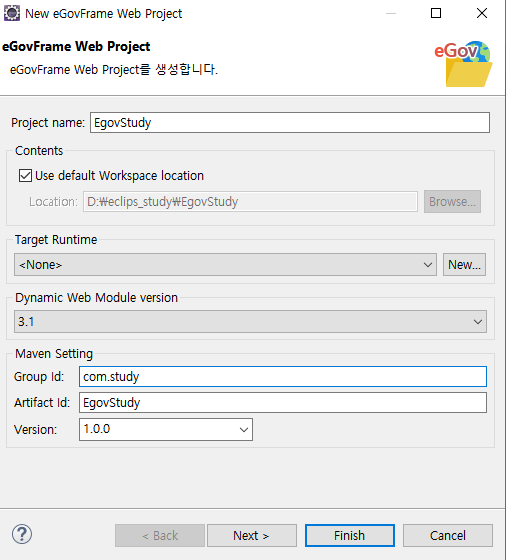메뉴 표시줄에서 File > New > eGovFrame Web Project를 선택