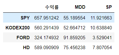 미국 증시에서는 개별종목인 포드보다 SNP500 수익률이 더 높고 -MDD도 더 낮기때문에 전략점수는 더더욱 좋아진다.
