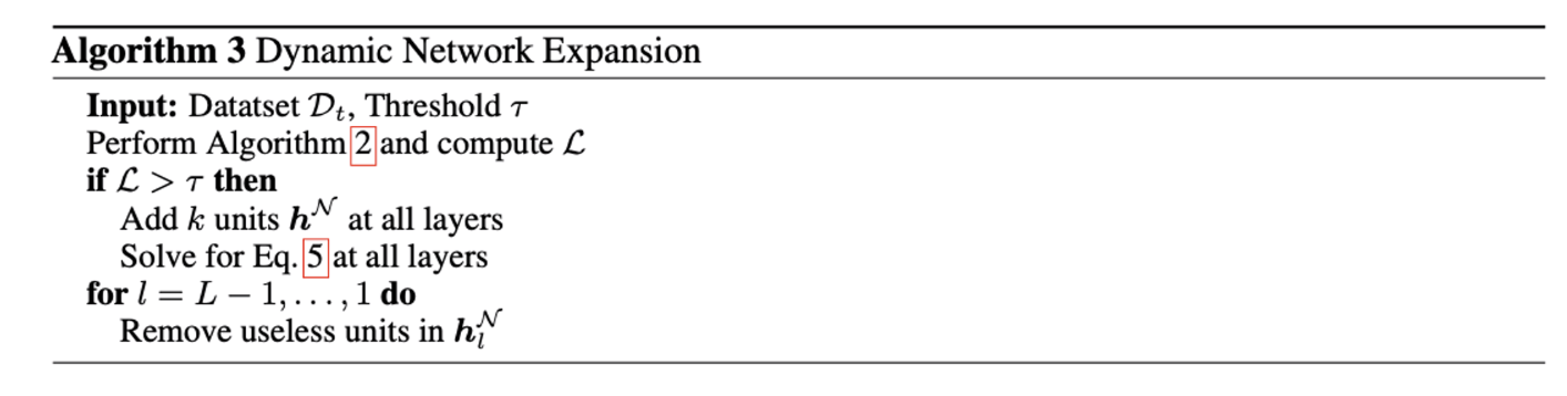 2) Deciding when to expand the network, and how many neurons to add이전 Network가 New Task를 충분히 해결할 수 있으면 expanding이 필요 없지만 아닌 경우는 필요함. 선택적으로 확장 가능해야함