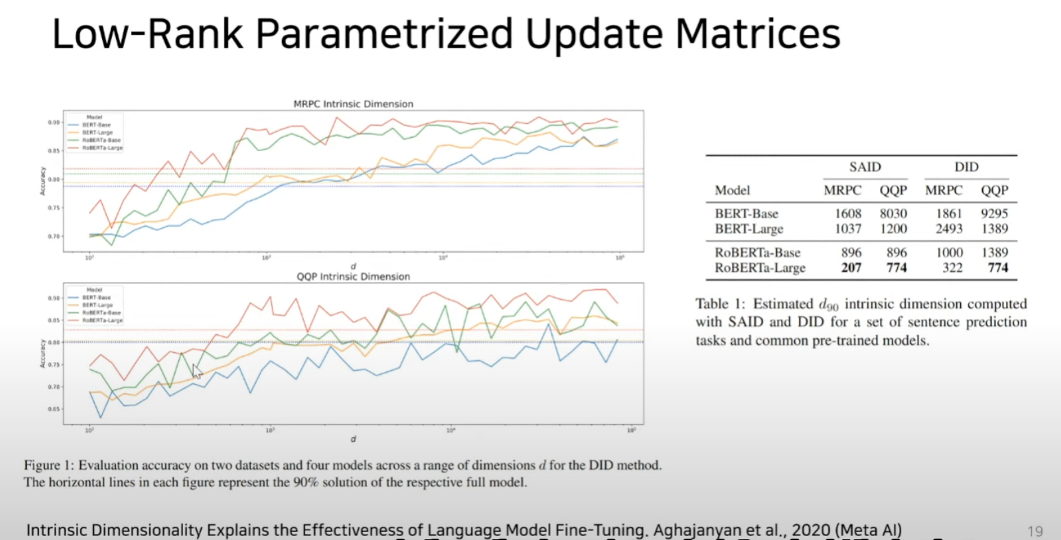 가중치 업데이트 행렬의 변화량이 low intrinsic rank를 가진다고 가정하고 방법을 제안.