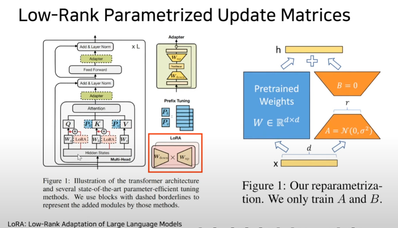 adapter기법은 transformer 레이어 사이에 adapter레이어를 끼워넣었기 때문에 연산이 시퀀셜하게 증가한다는 단점이 있었는데 LoRA는 A와 B를 weight에다가 합치기 때문에 연산이 증가하지 않음.