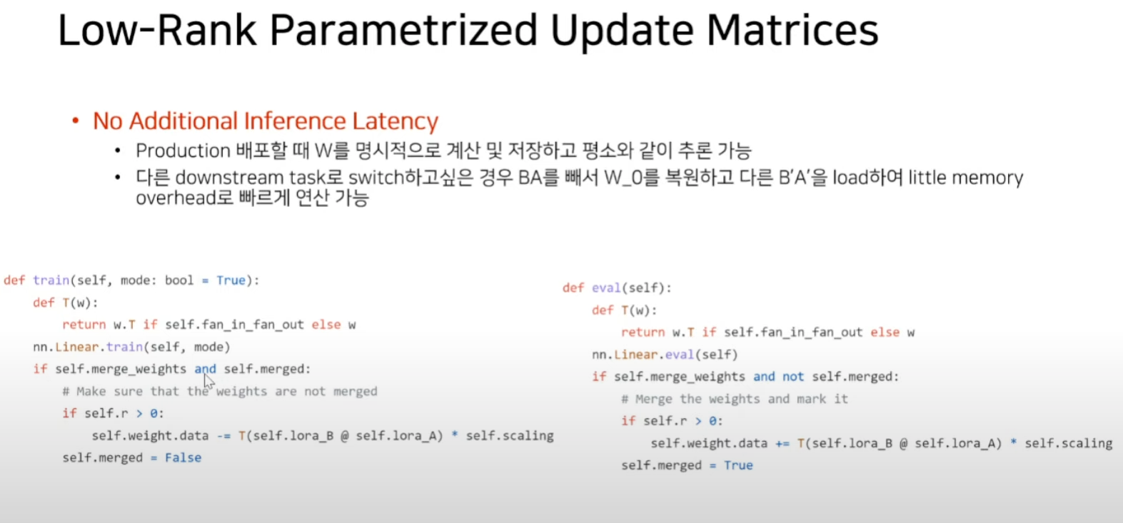 Adapter류의 기법과 다르게 inference latency가 발생하지 않음