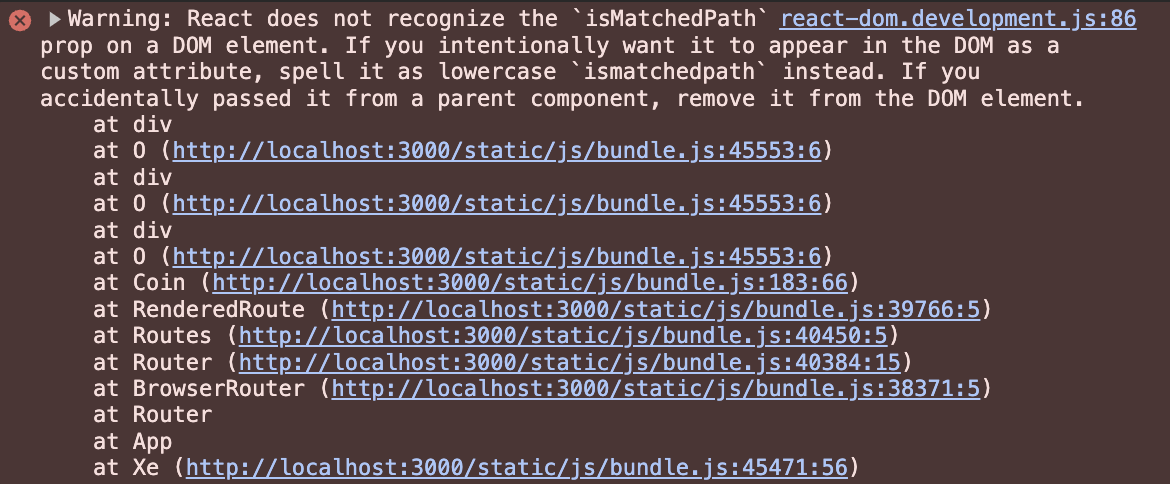 위 경고 문구가 나오는 이유는 isMatchedPath라는 props를 스타일 컴포넌트 내부에서만 사용하고 HTML 요소에는 전달되지 않아야 하기 때문이다.