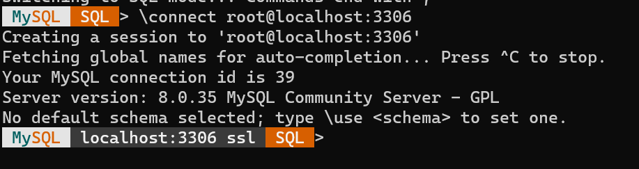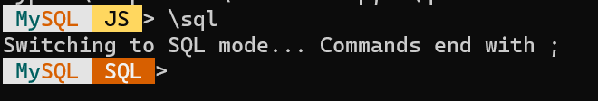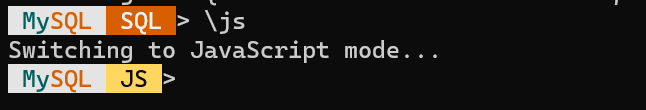 mysql shell을 시작하면 MySQL JS로 설정되어있어 JavaScript 모드로 실행된다. 따라서 SQL 모드로 실행하기 위해 설정을 해주어야 한다.