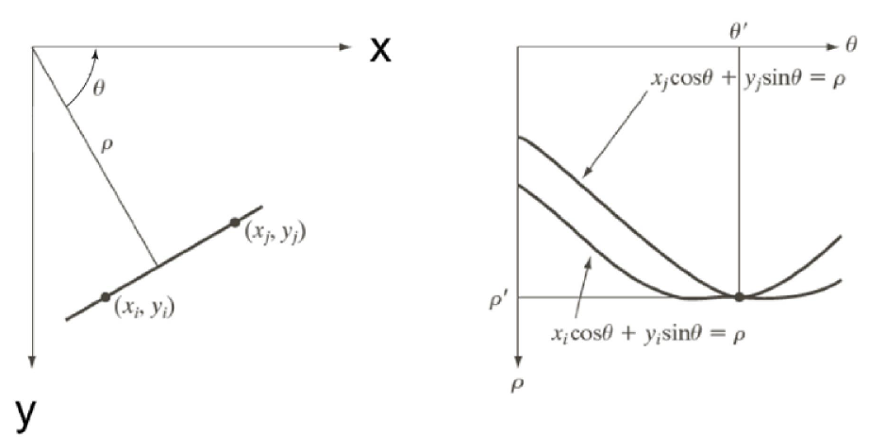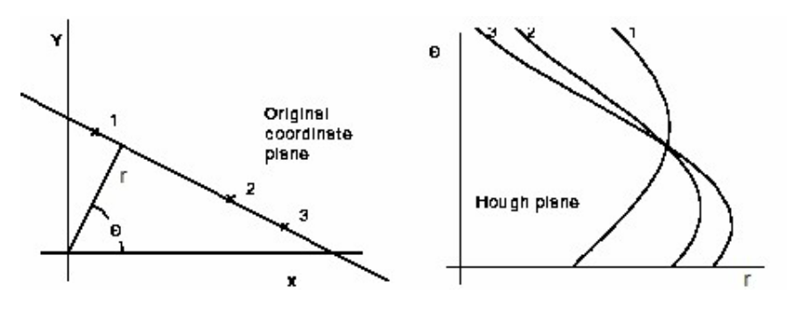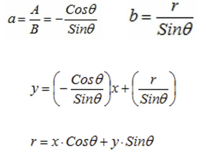 원점에서부터 직선까지의 거리를 r, x 축과의 기울기를 θ라고 하면, 다음의 수식들을 이용해 변환할 수 있다.