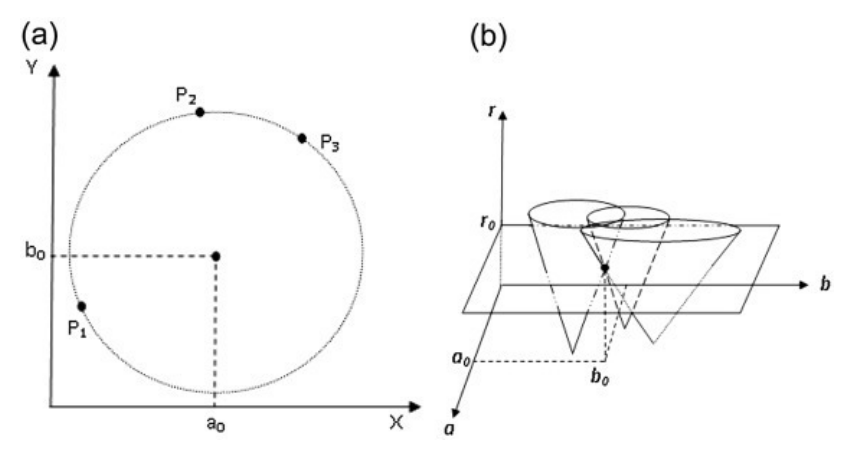r(c3)에 상수를 하나씩 대입시키면서 생각해 보면, 아래 그림과 같이 xy 공간에서 원 위의 한 점은 a, b, r의 3차원 파라미터 공간에서 원뿔의 표면으로 표현된다.