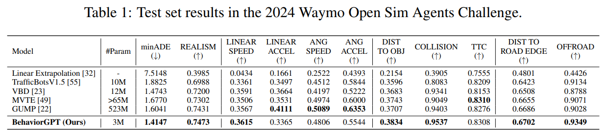 테스트셋에서 BehaviorGPT는 3M 파라미터로 minADE 1.4147, REALISM 0.7473를 기록했고, COLLISION 0.9537, OFFROAD 0.9349 등에서도 강한 성능을 보임