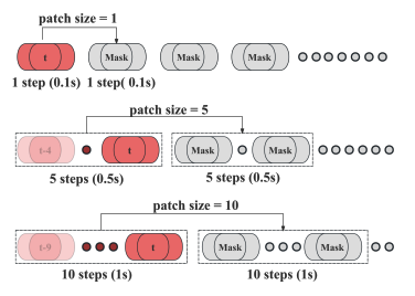 10Hz로 샘플링된 궤적에 대해, patch 크기를 각각 1, 5, 10 time step 으로 설정한 Next-Patch Prediction Paradigm 을 보여준다. 진한 빨간색 캡슐은 현재 시점 t 에서의 에이전트 상태를 나타내고, 흐릿한 빨간색 캡슐은과거 상태를 나타낸다. 회색 원은 생성을 위해 예측해야 하는 마스킹된 에이전트 상태를 의미한다. 우리 방법은 여러 시간 스텝에 걸친 에이전트 상태들을 하나의 patch 로 묶고, 학습 과정에서 각 patch가 그 다음 patch를 예측하도록 만든다.