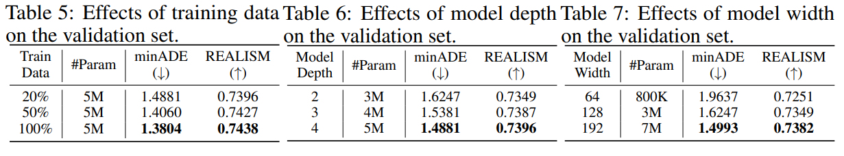5M 모델 기준으로 training data를 20%에서 100%로 늘리면 minADE가 1.4881 → 1.3804, REALISM이 0.7396 → 0.7438로 좋아짐, 또 depth를 2→4, width를 64→192로 키우면 전반적으로 성능이 향상됨