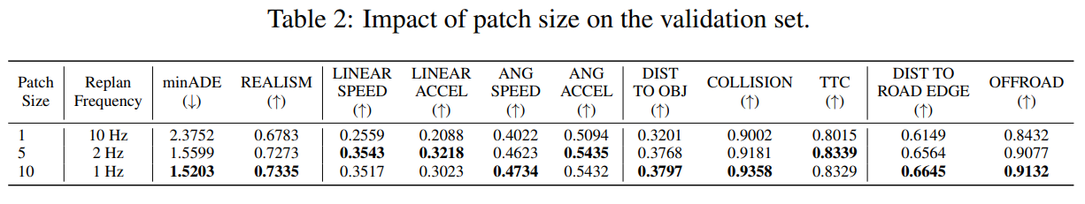 예를 들어 validation에서 patch size 1 → minADE 2.3752, REALISM 0.6783, patch size 10 → minADE 1.5203, REALISM 0.7335로 좋아짐, 저자들은 이를 통해 NP3가 장기 reasoning에 도움을 준다고 해석함