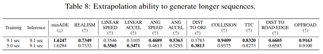 마지막으로 extrapolation 실험에서는 5초 길이 시퀀스로 학습한 모델이 9.1초 생성에서도 거의 비슷한 성능을 냄, baseline이 minADE 1.6247 / REALISM 0.7349이고, 5초 학습 후 9.1초 생성은 1.6294 / 0.7333