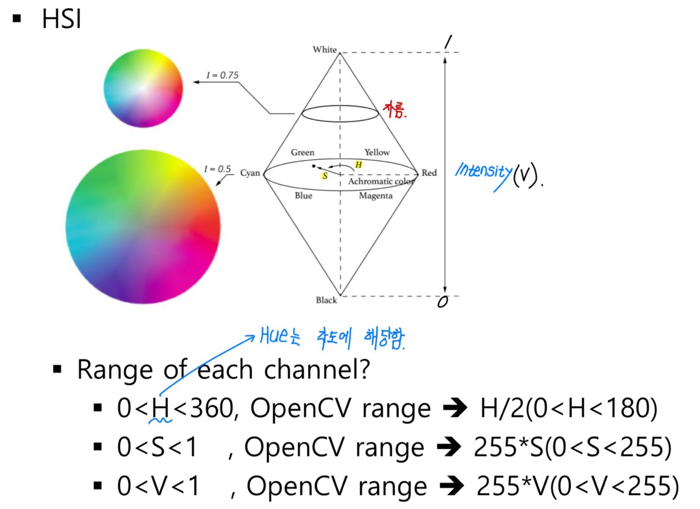 HSI는 Hue(색조), Saturation(순도), Intensity(세기)로 이루어져 있다.