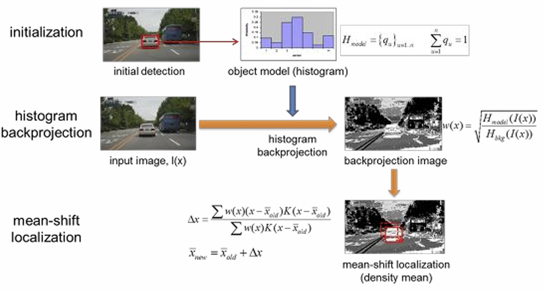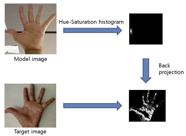 히스토그램 역투영이라고도 하며, 입력 이미지와 같은 크기이지만 하나의 채널만 가지는 이미지를 생성한다. 이 이미지의 픽셀은 특정 object에 속할 확률을 의미하며, 관심 오브젝트 영역에 속한 픽셀이 나머지 부분보다 더 흰색으로 표현된다.