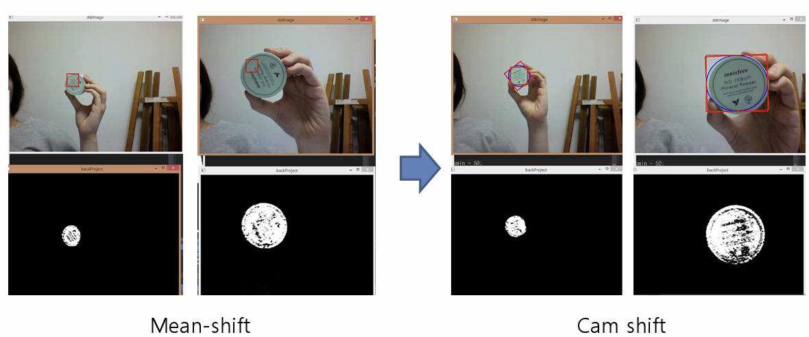 Camshift는 mean shift의 단점을 보완해서 만든 추적방법이다.