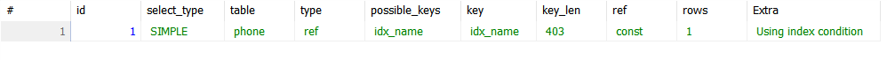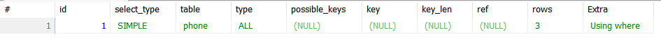 Using where EXPLAIN SELECT * FROM phone WHERE phone_name = 'galaxyS23';