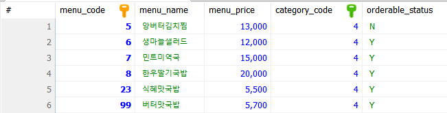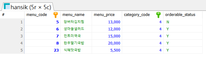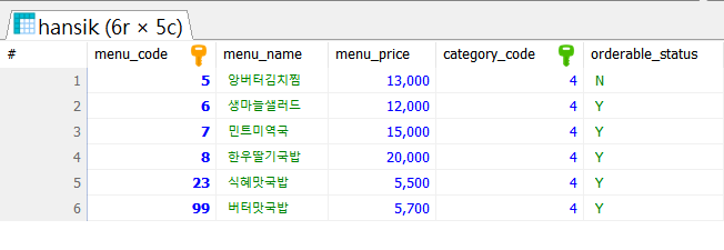 VALUES(NULL, '์ํ๋ง๊ตญ๋ฐฅ', 5500, 4, 'Y');