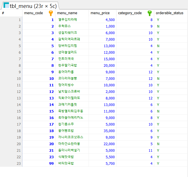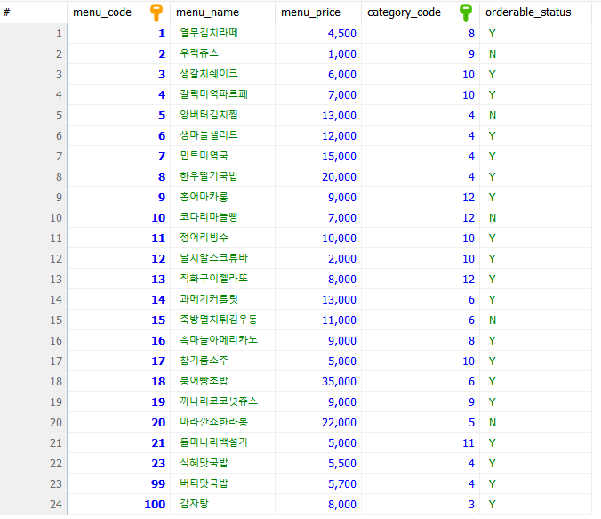 VALUES(100, '๊ฐ์ํ', 8000, 3, 'Y'); -- ์ฝ์