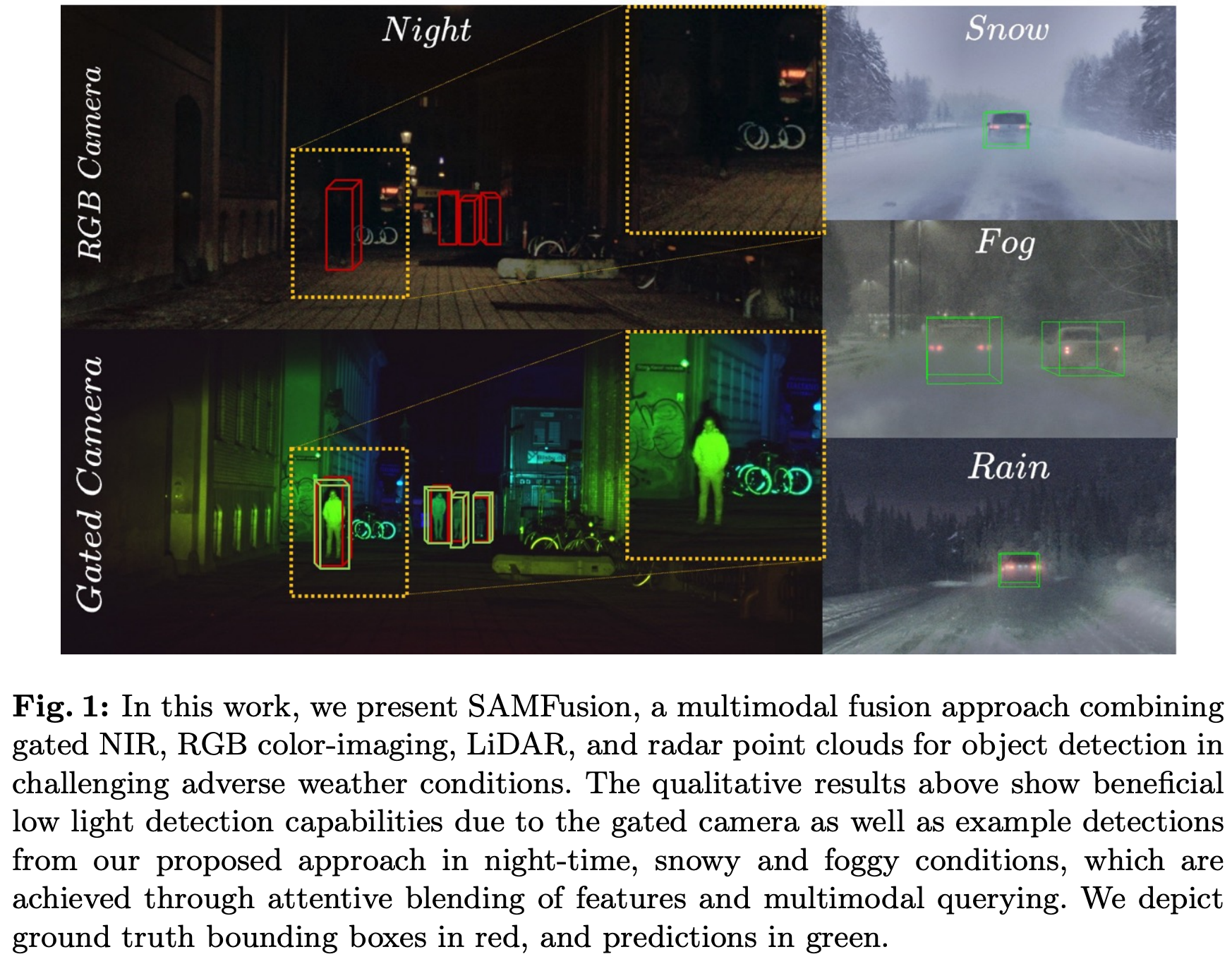 | SAMFusion | ECCV 2024 | RGB + LiDAR + Radar + IR | 다양한 센서 가중치를 환경 조건에 따라 적응적으로 조절하며 악천후 대응 |