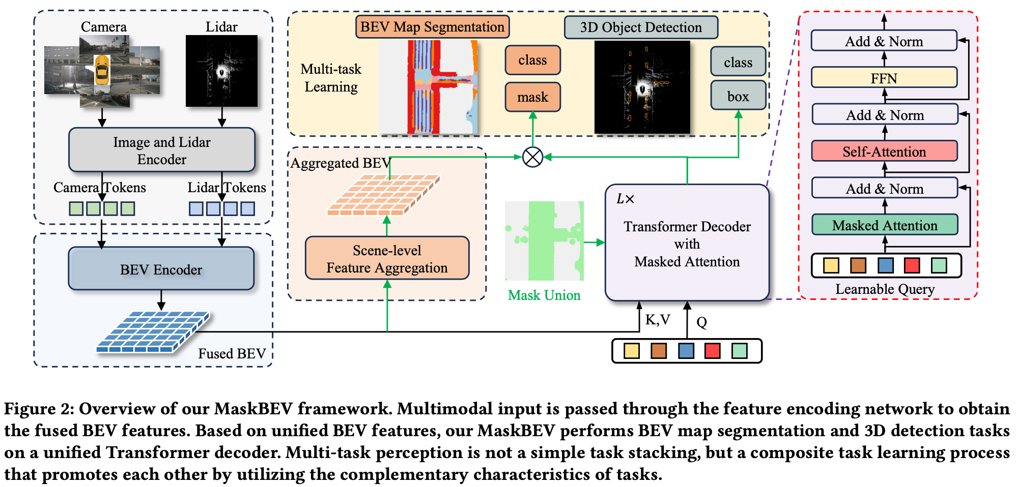 MaskBEV는 BEVFormer 기반의 query-centric 구조를 확장하여, 각 BEV query가 다양한 태스크에 대한 정보를 동시에 추론할 수 있도록 설계되었다. 구체적으로는, BEV query와 태스크를 식별하는 mask token을 결합하여 입력하면, Transformer 디코더는 이 task-aware query들을 병렬로 처리하면서, 객체 검출, 시맨틱 분할, 차선 추출 등의 다양한 결과를 한 번에 예측한다.