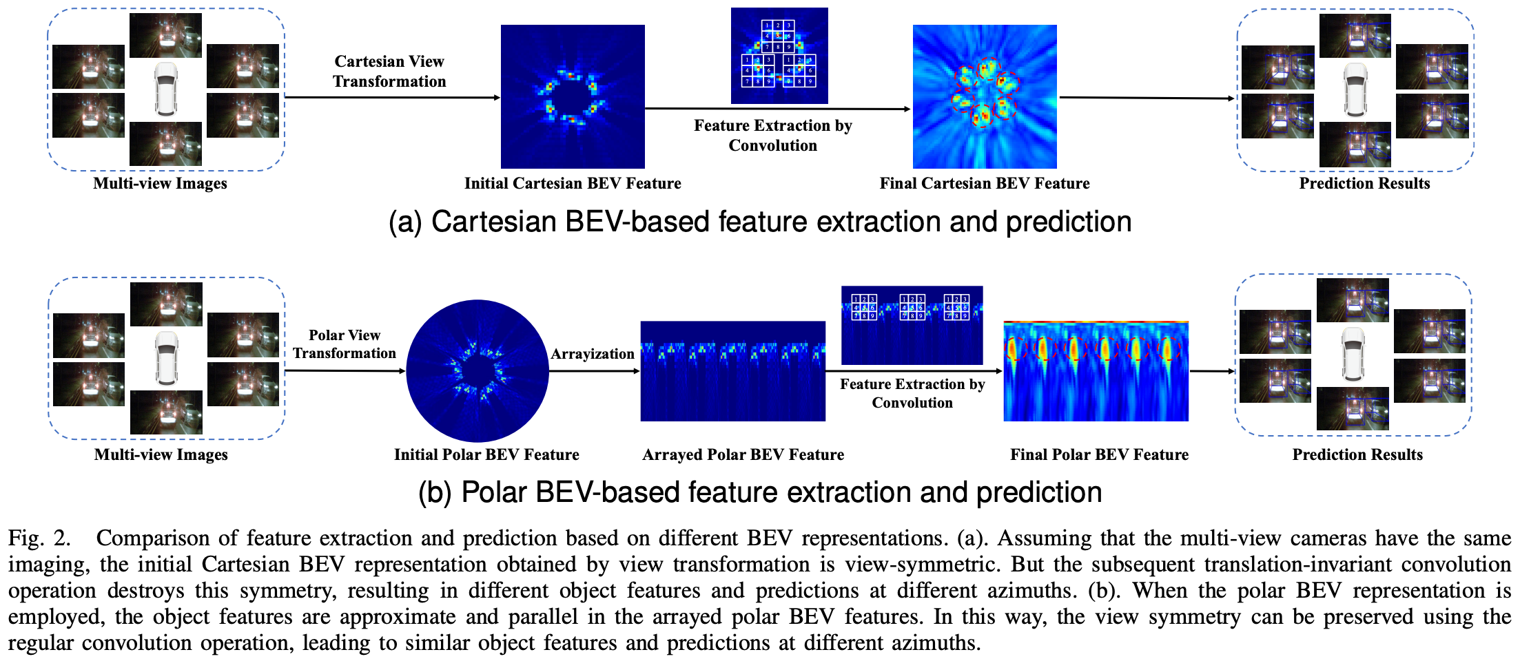 기존의 BEV 표현은 직교 좌표(Cartesian grid)를 사용하여 BEV 공간을 구성해 왔다. 하지만 이 방식은 이미지 정보의 분포와 격자 구조 간의 불일치로 인해 여러 한계를 나타낸다. 예를 들어, 카메라에서 가까운 영역은 정보가 조밀하지만, 직교 BEV에서는 동일한 격자 크기를 사용하므로 근거리 정보가 희석되고, 반대로 원거리에서는 불필요하게 높은 해상도의 연산이 낭비되는 문제가 발생한다.
