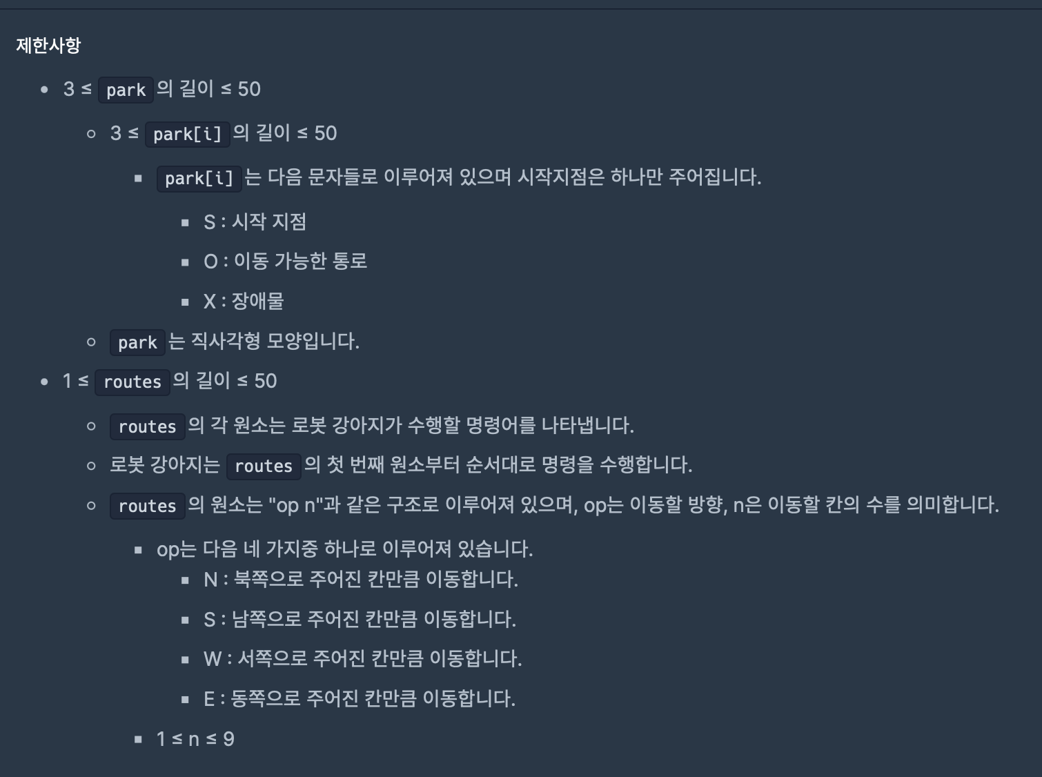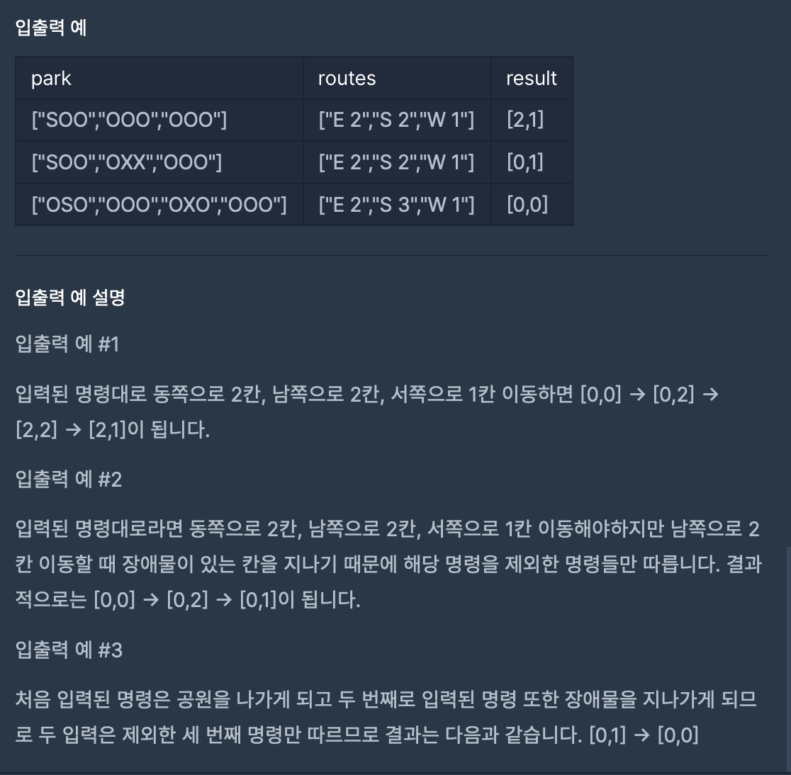 지나다니는 길을 'O', 장애물을 'X'로 나타낸 직사각형 격자 모양의 공원에서 로봇 강아지가 산책을 하려합니다. 산책은 로봇 강아지에 미리 입력된 명령에 따라 진행하며, 명령은 다음과 같은 형식으로 주어집니다.