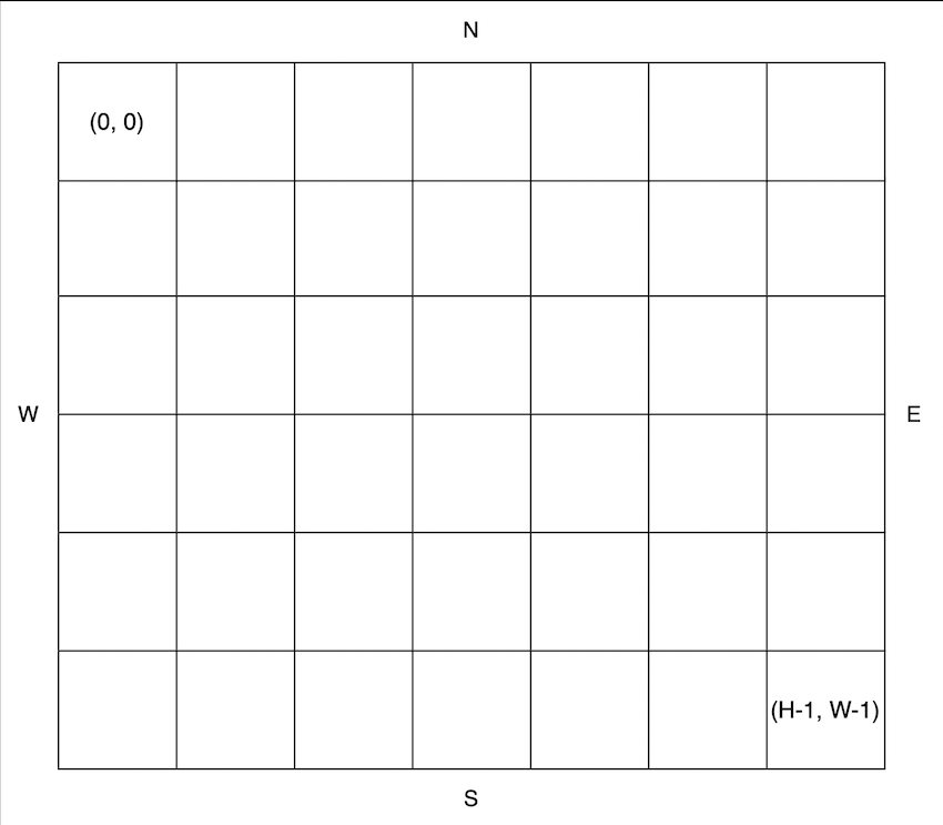 공원의 가로 길이가 W, 세로 길이가 H라고 할 때, 공원의 좌측 상단의 좌표는 (0, 0), 우측 하단의 좌표는 (H - 1, W - 1) 입니다.