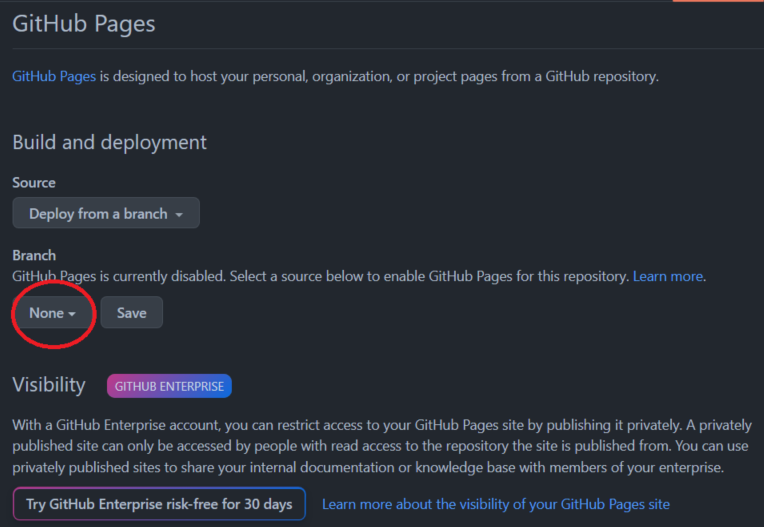 해당 메뉴 페이지에서 Branch에서 호스팅해서 보여주고자 하는 브랜치를 설정합니다.