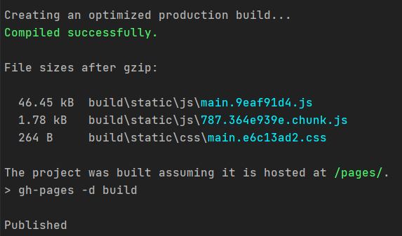 수정한 후에 add와 commit을 해서 변경내용 저장 후 git push로 리포지토리에 업로드 해주세요. 그 후 터미널에 npm run deploy를 입력해주세요. 무언가 진행되다가 다음과 같이 뜨면 완료된 것입니다.
