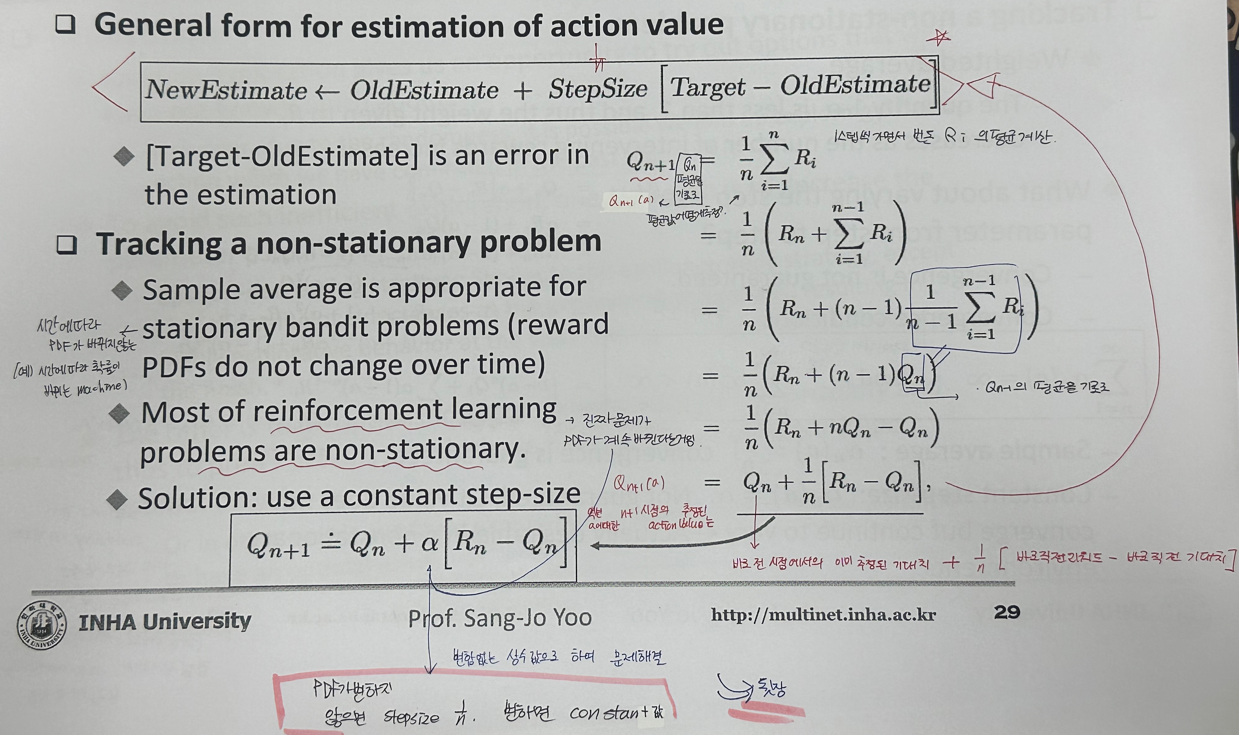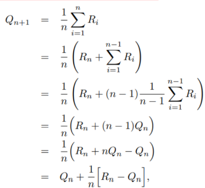 맨 윗줄은, 1스텝씩 가면서 번돈 Ri의 평균을 계산하는 것. 그러니까 1/n을 했겠지