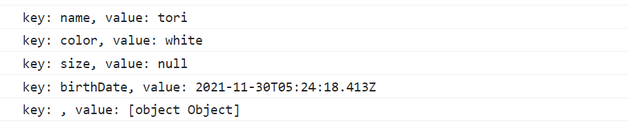 console.log(`key: ${key}, value: ${value}`);