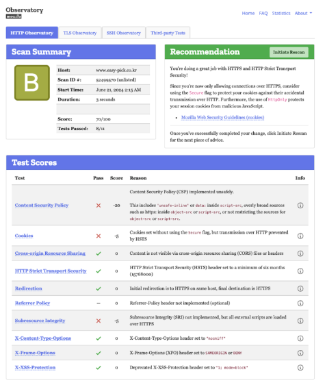 회사 홈페이지가 검색 순위에 노출되지 않는 문제를 웹사이트 취약성 분석을 통해 보안 점수를 D에서 B로 올려 SEO 성능을 개선했다.