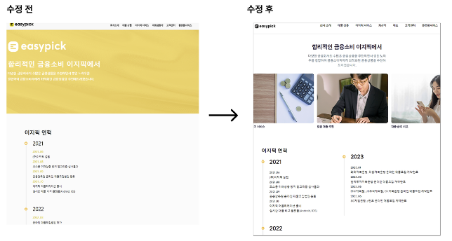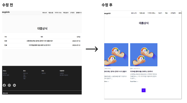 회사 소개 페이지는 단순한 텍스트 나열에서 벗어나, 주요 서비스들을 슬라이드 형식으로 시각적으로 표현했다. 대출 상식 페이지는 썸네일과 글 요약을 추가하여 사용자들이 빠르게 내용을 파악할 수 있도록 개선했다.
