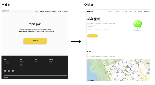 제휴 문의 페이지는 중요한 페이지로, 이전에는 문의하기버튼 클릭 →모달창 열림 → 이메일을 복사 버튼 클릭 → 이메일 보낼 사이트로 이동 → 이메일을 붙여넣기 → 문의 등의 사용자가 여러 단계를 거쳐야 하는 비효율적인 UI 구조였다. 이를 개선하여 이메일 복사 기능을 이메일 보내기로 변경해 클릭 한 번으로 이메일을 보낼 수 있도록 했고, 회사의 위치 정보도 직관적으로 제공하여 사용자 편의를 높였다.