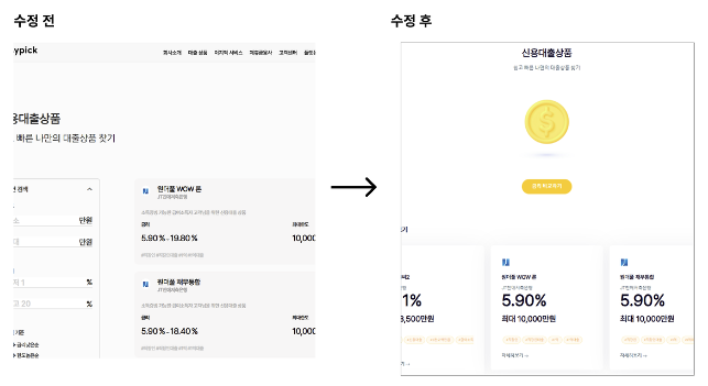 대출 상품 소개 페이지는 우리와 제휴하고 있는 금융사들에서 제공하는 대출 목록들을 설명하고 있는 페이지 이다. 이는 사용자들에게 우리가 제공하는 대출의 종류를 설명하고, 알맞은 상품을 선택하도록 도와드리는 페이지 이기 때문에 이 또한 중요한 사안 중 하나였다. 이전 버전과의 비교를 통해 주요 개선 사항을 자세히 살펴보자.
