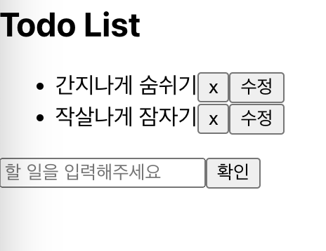 update 기능을 추가하기 위해 delete 기능과 마찬가지로 무엇을 수정할지 targeting 하고 list에서 input 화면으로 바뀌는 기능을 추가한다. 이 기능을 위해선 삼항 연산자를 통해 수정이 클릭되지 않았을시 updateTarget.id !== todo.id