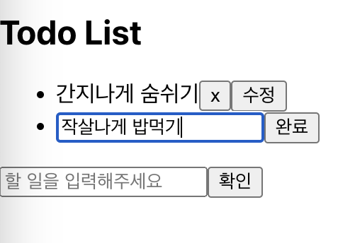 을 돌려 기존과 같이 list를 작성하고 클릭되었을 시 input으로 바뀐다. targeting을 위해 수정할 state를 객체형태로 만들어주어 id와 text값을 가진다.