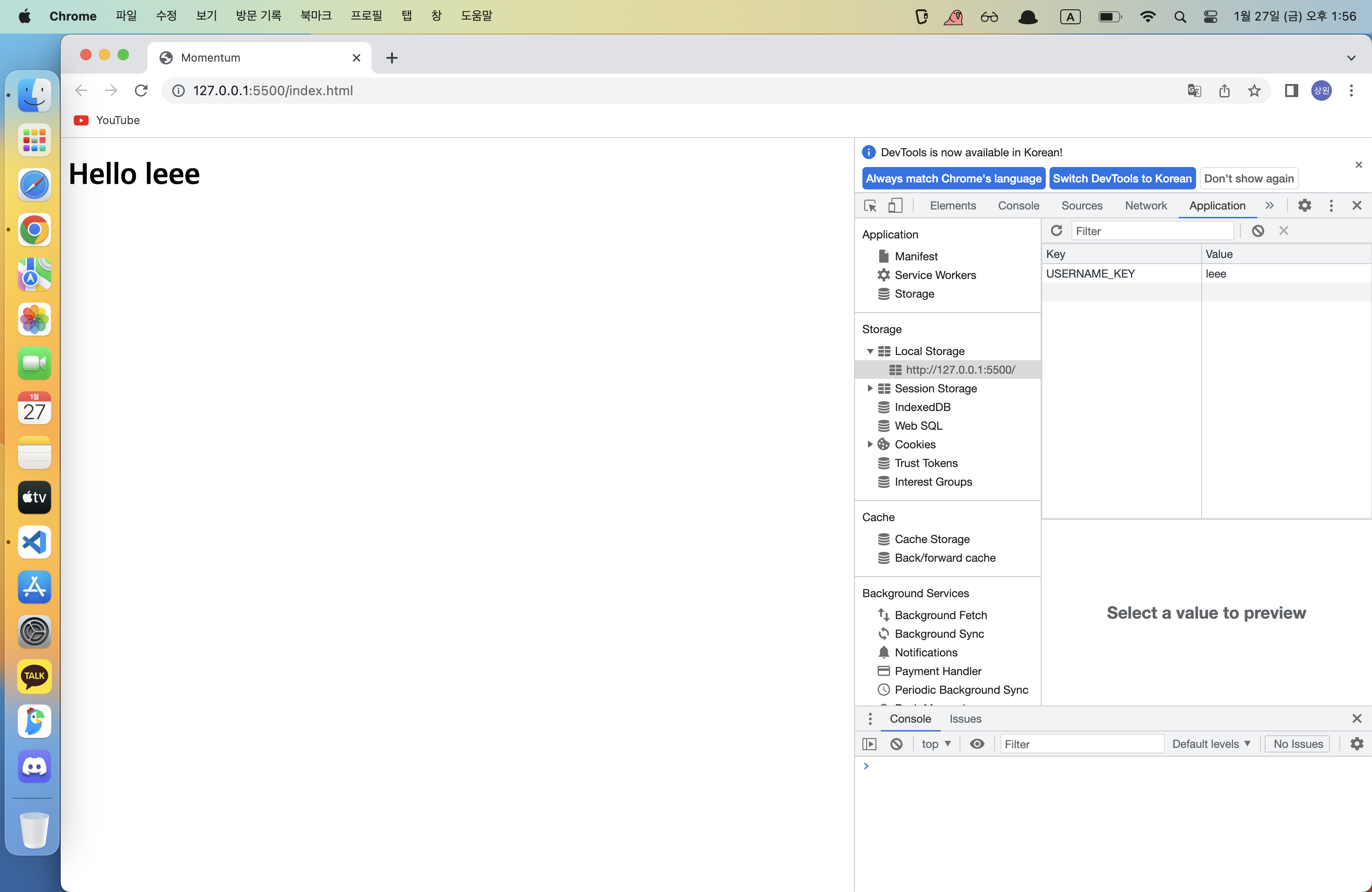 로그인시 localstorage에 username을 저장하고 저장시 로그인 폼은 css hidden을 통해 숨긴다. localstorage에 저장된 username 값이 있을 때는 "hello 'username'" 을 출력한다.