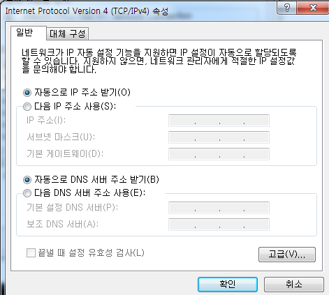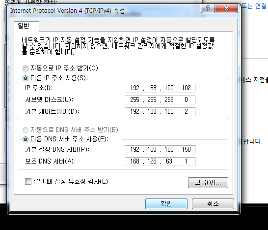 테스트를 진행할 윈도우 7 머신에서 기본 DNS 서버를 WInser1 머신 IP 주소로 바꾼다.